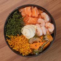 70g de Salmão Grelhado, 70g de Camarão Empanado, 250g de Arroz Oriental, Cream Cheese, Couve Crispy, e Cenoura Crispy.
