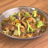 Carne, Frango e Camarão fritos na manteiga de garrafa com legumes e macarrão.