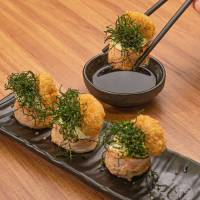 4un. Deliciosos Camarões Empanados enrolados com Salmão e Cream Cheese, Maçaricados com azeite.