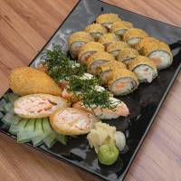 15 Hot Roll Salmão e Camarão, 1 Porção de Niguiri Salmão Maçaricado (4 unidades), e 2 Tigrados.