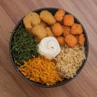 70g de Salmão Grelhado, 70g de Camarão Empanado, 250g de Arroz Oriental, Cream Cheese, Couve Crispy, e Cenoura Crispy.