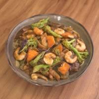 Carne, Frango e Camarão fritos na manteiga de garrafa com legumes e macarrão.
